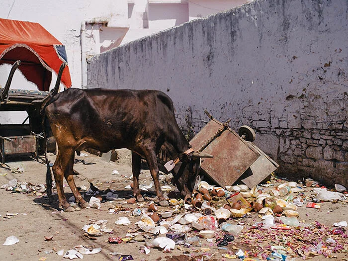 Cow looking for food in the trash.