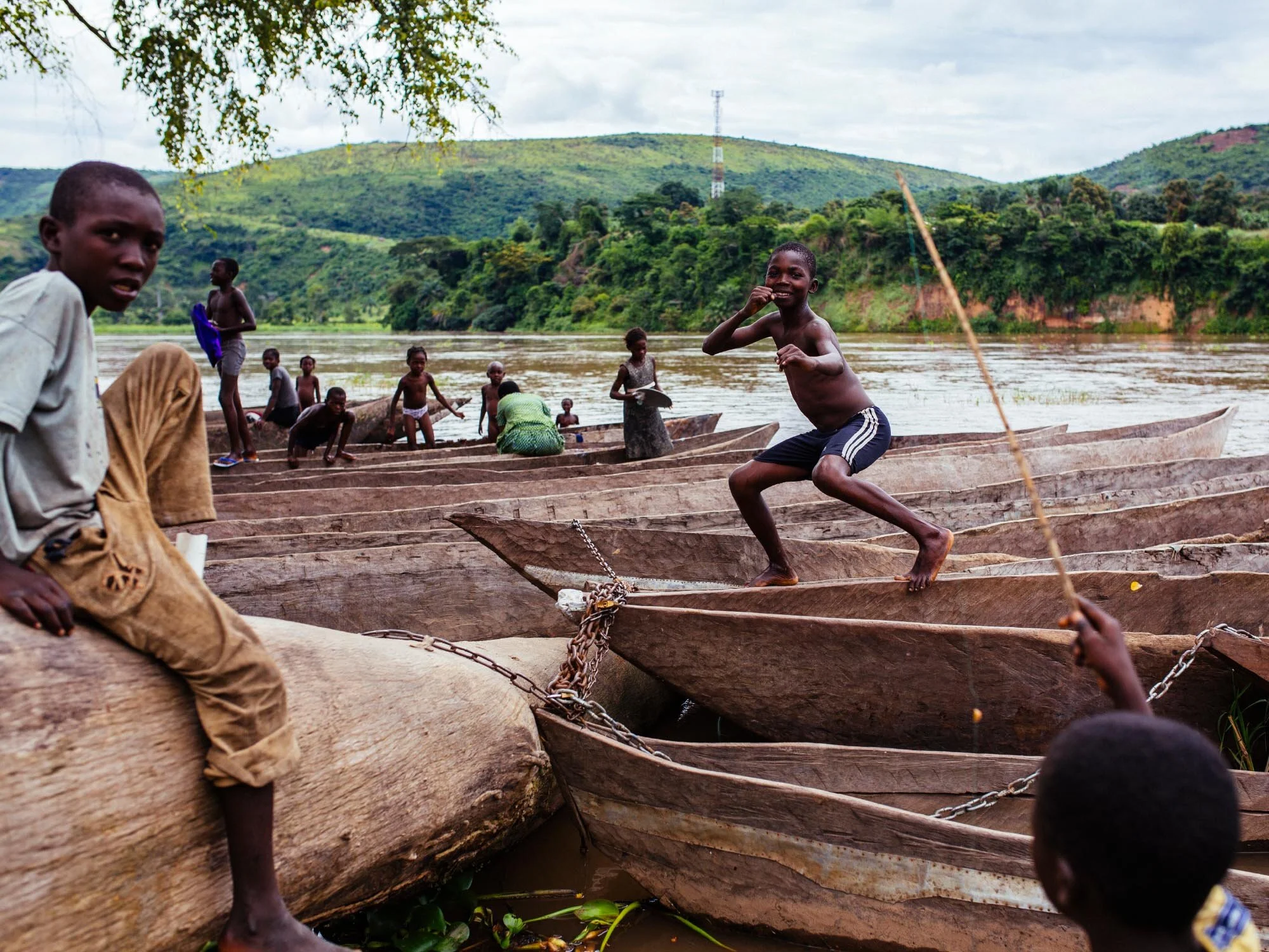 Kids playing on the banks of the Kenge River. Democratic Republic of Congo.